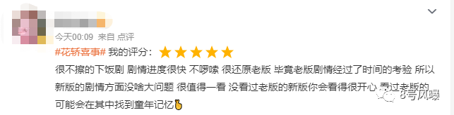 综合看来,《花轿喜事》在剧本方面确实认真去还原了,毕竟能成为经典肯定是有可取之处的。剧方考虑得当,也能收获网友的认可。