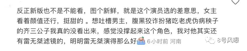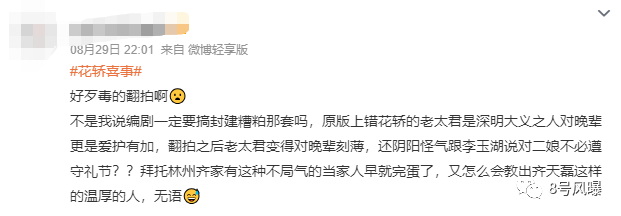 还有网友吐槽角色人设改动得离谱,齐家老太君明明是深明大义的人,对晚辈也爱护有加,但新版里老太君对晚辈却很刻薄;明明作为大家族的当家人非常注重礼节,却非要阴阳怪气地对女主说对二娘不必遵守礼节...