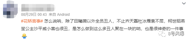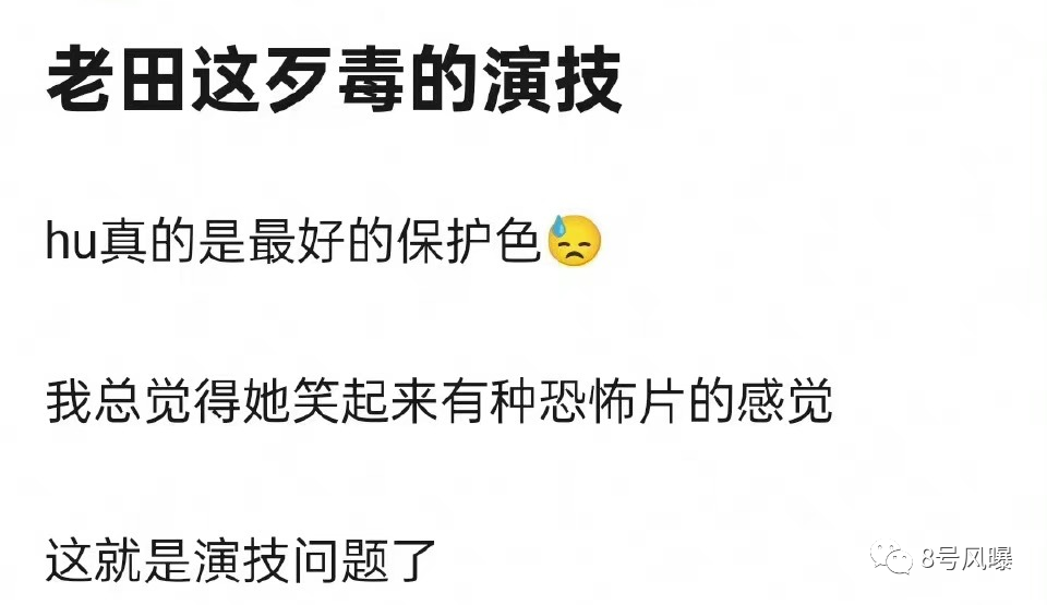 有网友评价说,田曦薇的哭戏更是渗人,有一种在演恐怖片的感觉,知道她哭得很难过,但注意力全被脸部肌肉的扭曲吸引了。