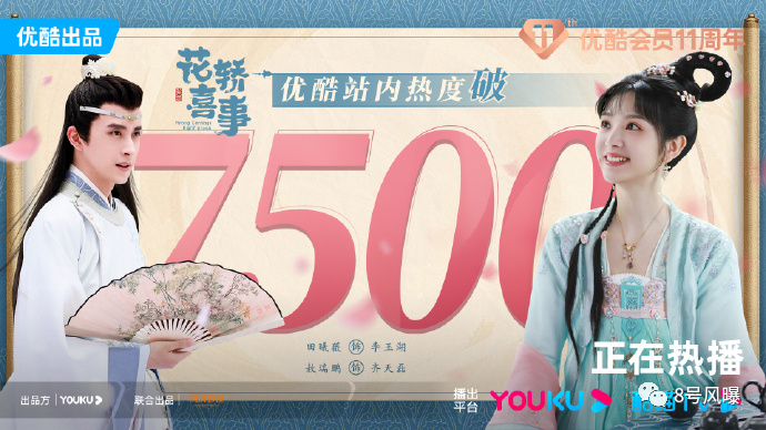 《花轿喜事》8月28日开播,播出两天后优酷站内热度值破7500,处在一个不上不下的水平,毕竟两位主演的号召力是比不上大流量的。