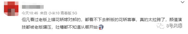 翻拍的风险本身就很大,既然挂着这个名头,就应该努力贴合,现在的《花轿喜事》却成了四不像,跟老版比差了不是一星半点,想要成为《上错花轿嫁对郎》2.0大概率是不可能的了。