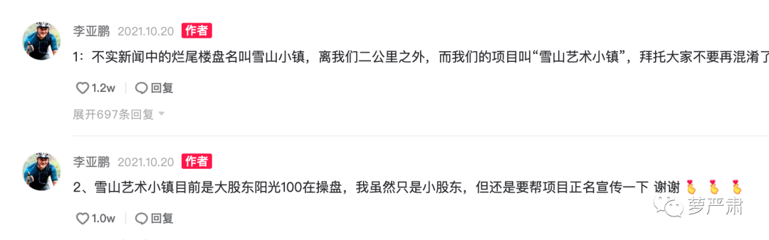 他在评论里专门解释,“雪山小镇”和“雪山艺术小镇”是两回事,自己现在只是“雪山艺术小镇”的小股东。