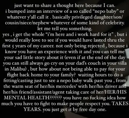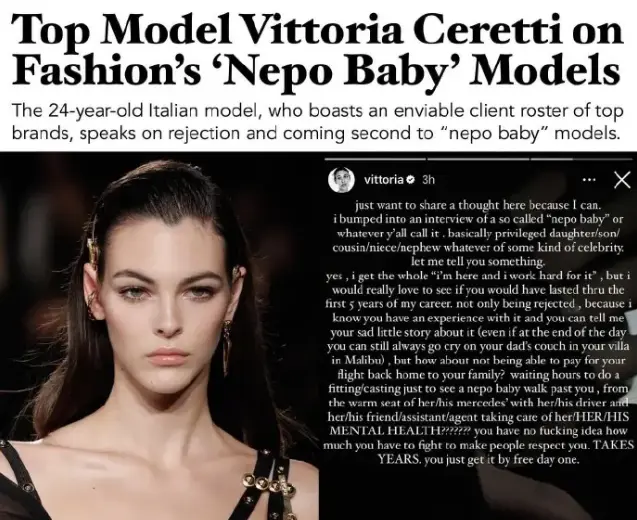 莉莉这一番话引起了年纪相仿、同为模特的VC的强烈不满,她在一篇帖子里开撕了“一位靠裙带关系享有特权的明星子女”。