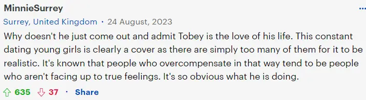 “他咋不干脆出柜、痛快承认托比马奎尔(第一代蜘蛛侠的扮演者、小李子的好友)才是他的一生挚爱呢?