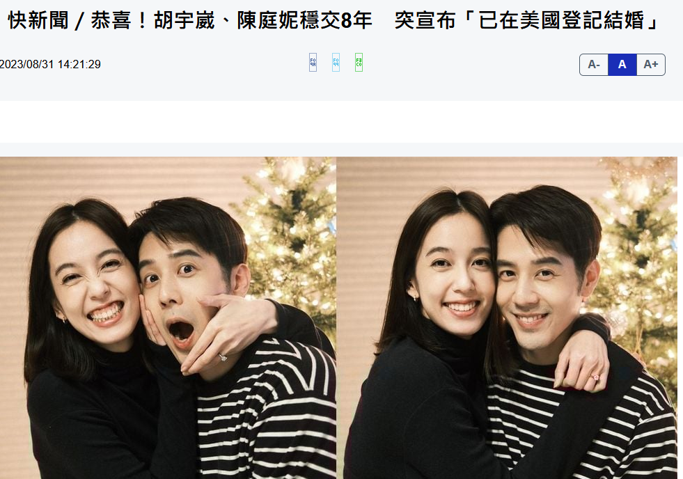 胡宇威陈庭妮官宣已在美国登记结婚 称明年在台湾办婚礼
