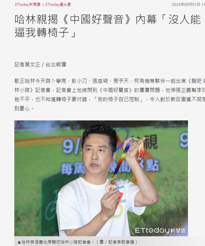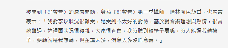 9月1日,据台媒,哈林庾澄庆出席活动时被记者被问到《中国好声音》相关问题,他表示自己没有听说过转椅子要钱,但只能代表自己的情况。此外,他表示对李玟的经历感到难过: “我对李玟状况很难受,她受到不太好的对待,基于对音乐理想与热情,很替她难过。”