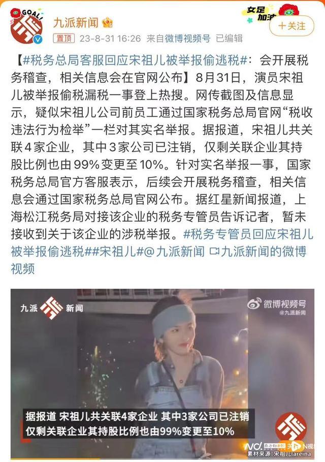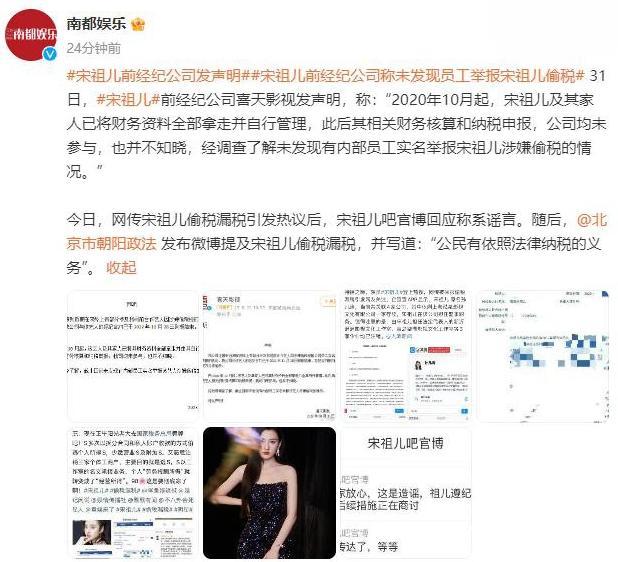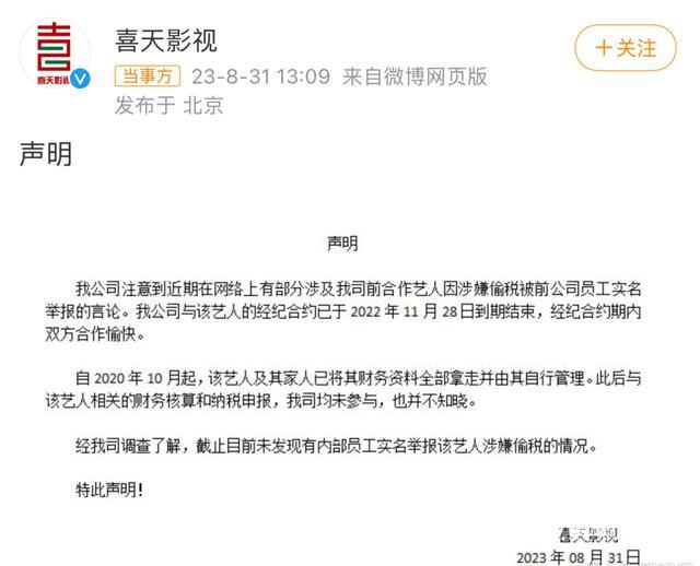 8月31日下午1点,宋祖儿之前的合作公司喜天影视发布声明,称其与宋祖儿的合约于2022年11月28日到期结束,且自2020年10月起,该艺人与其家人已拿走全部财务资料自行管理。喜天影视均未参与,并不知晓。该公司表示,经调查了解,截至目前未发现有内部员工实名举报宋祖儿涉嫌偷税的情况。