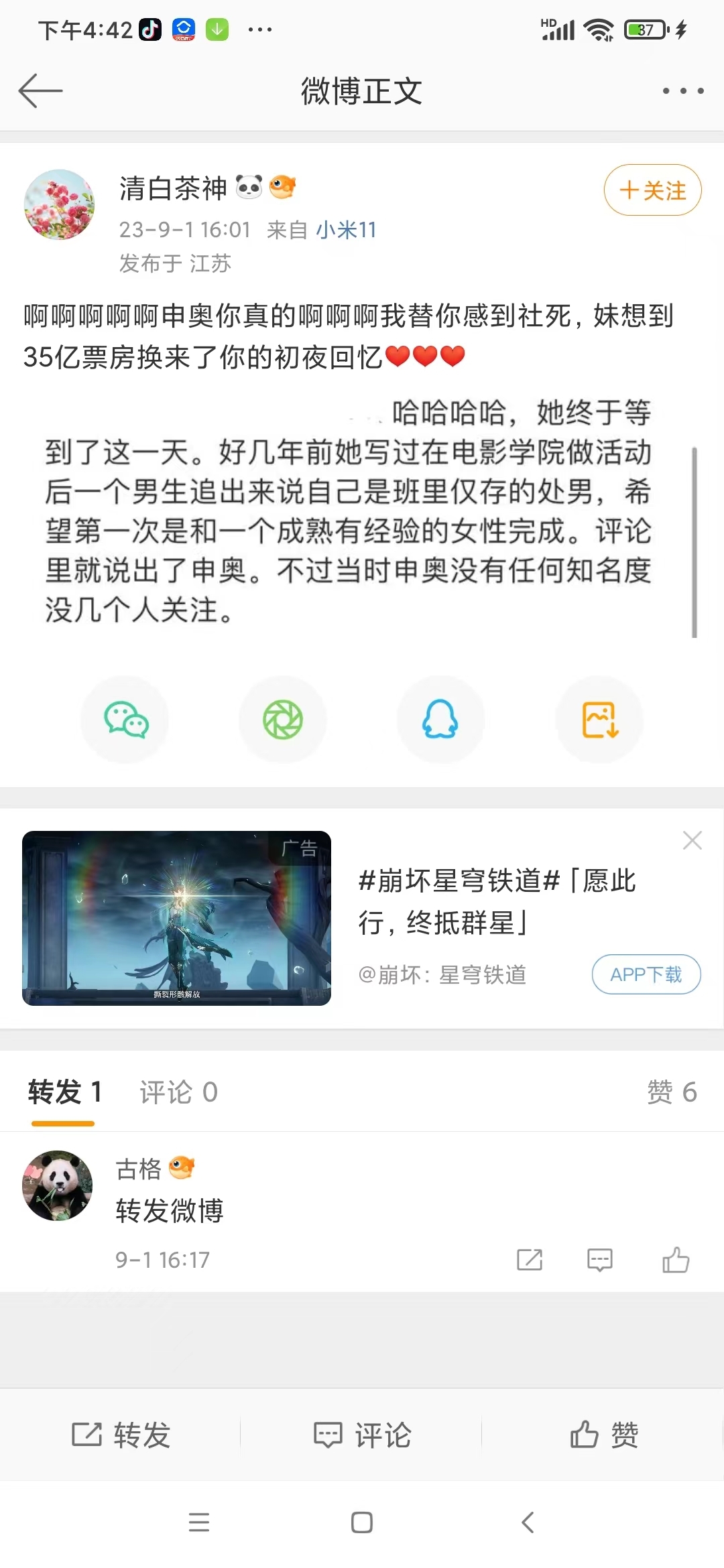 还有网友发文替申奥感到社死,称“没想到35亿票房换来了你的初夜回忆”。