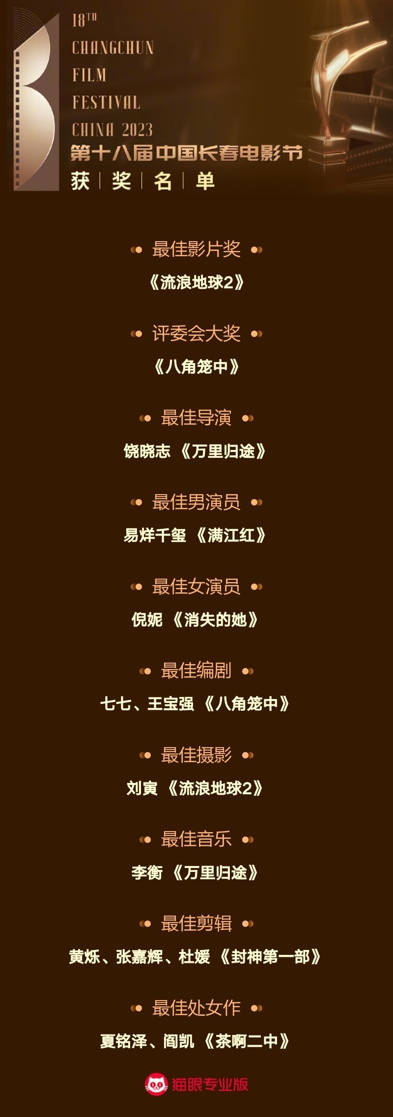 9月2日,第十八届中国长春电影节“金鹿奖”获奖名单在吉林长春揭晓。其中,郭帆执导国产科幻大片续集《流浪地球2》斩获最佳影片奖,易烊千玺凭借《满江红》夺最佳男演员奖,倪妮凭借《消失的她》夺最佳女演员奖。