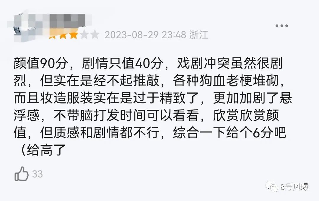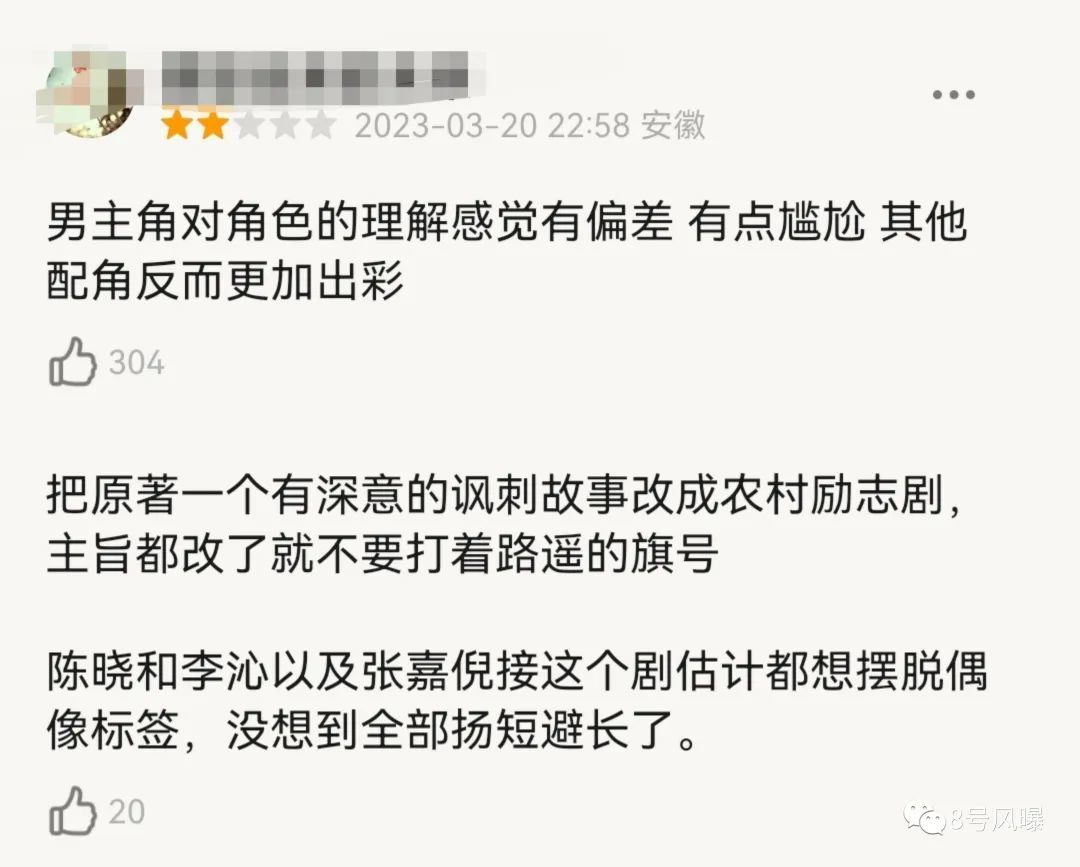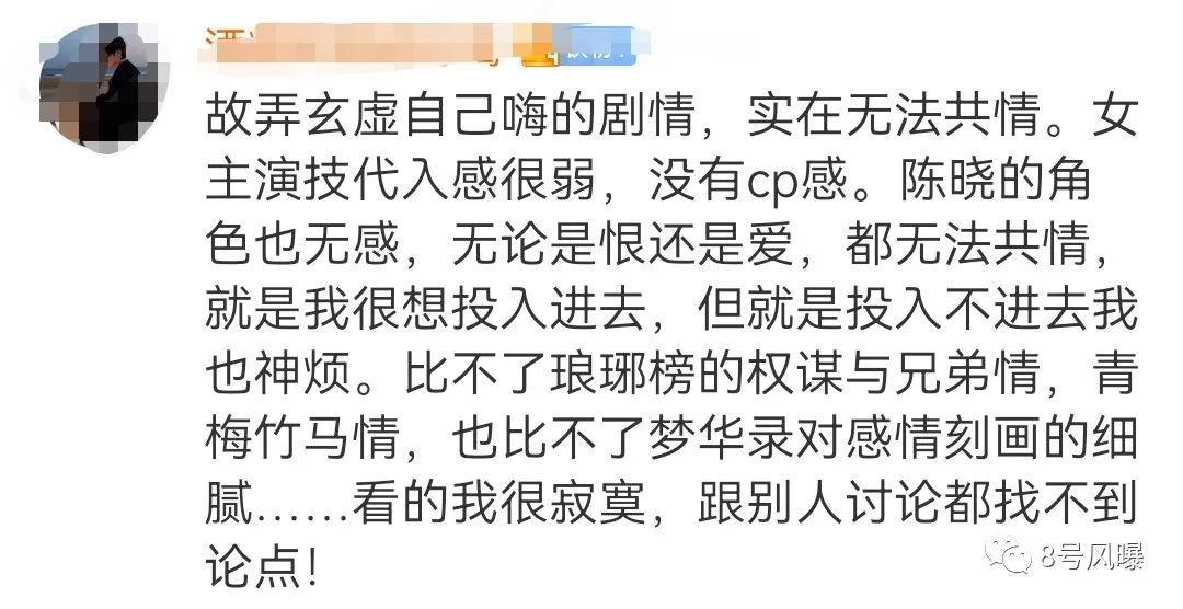 有网友分析这部剧没有爆的原因,一是剧情故弄玄虚,让人无法共情,二是女主演技代入感很弱,跟陈晓也没有cp感,反而更像姐弟,三是陈晓的角色人设不吸引人,没什么亮点。