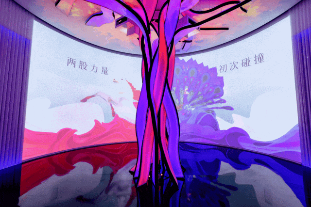 走进整个展区的中心位置,映入我们眼帘的是由装置艺术及绮丽光影组合打造而成的「灵感之树」,它是以鲜明的红蓝两色流转、碰撞,寓意两个世界的交汇融合。