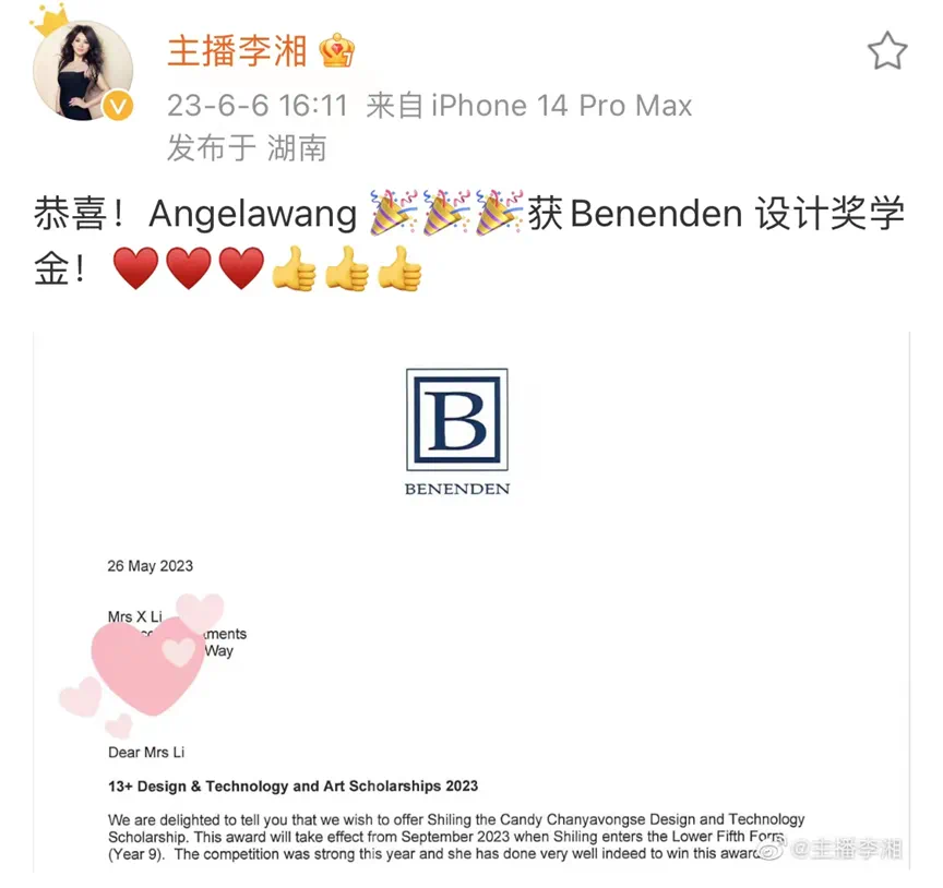 她11岁时的生日礼物,李湘还以她的名义成立了Angela公益金。