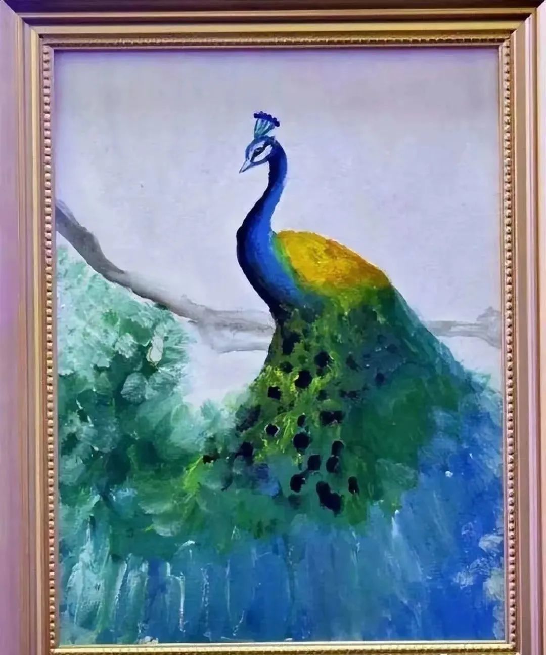 8岁画出的作品《孔雀》,拍卖价达12万。↓