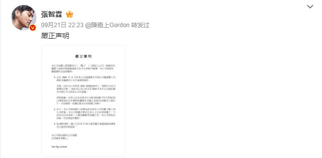 9月21日,张智霖在社交平台发表经纪公司声明,回应被牵涉香港“币圈”骗局,经纪公司称张智霖与JPEX已于去年九月终止合作,但JPEX仍在非法使用张先生形象宣传,张智霖先生本人并未参与投资和其他活动,并积极配合协助调查。此前,据港媒报道,加密货币交易平台JPEX涉诈骗案继续发酵,警方至今共拘捕11人,曾为该平台代言的港星张智霖,21日到湾仔警署协助调查,现已获准离开。