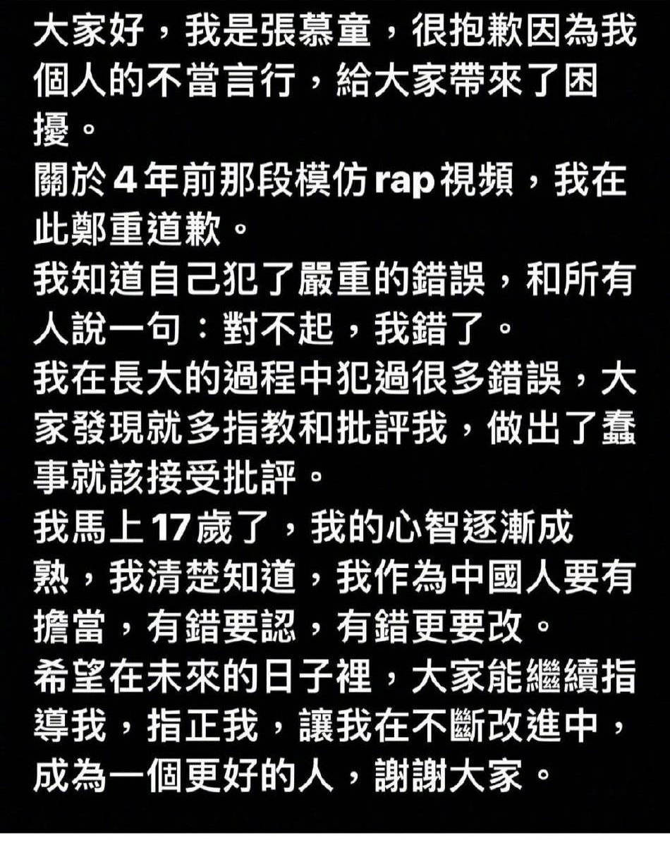 9月27日,张智霖袁咏仪的儿子张慕童就模仿rap歌手做出“眯眯眼”手势被批歧视亚裔一事道歉:“我知道自己犯了严重的错误,和所有人说一句,对不起,我错了。”他还表示“我清楚地知道,我作为中国人要有担当,有错要认,有错更要改。希望在未来的日子里,大家能继续指导我,指正我,让我在不断改进中,成为一个更好的人,谢谢大家”。