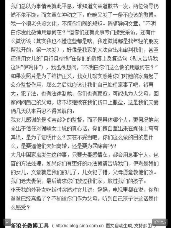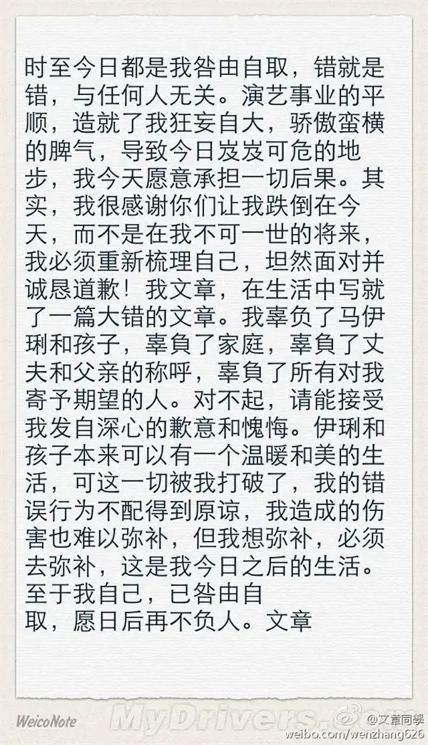 出轨被曝出后,文章发布长文,向妻子道歉,进行自我反省。