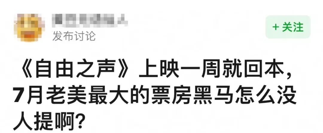 但,和同期上映的《芭比》、《碟中谍7》相比,《自由之声》却没有翻起任何水花。