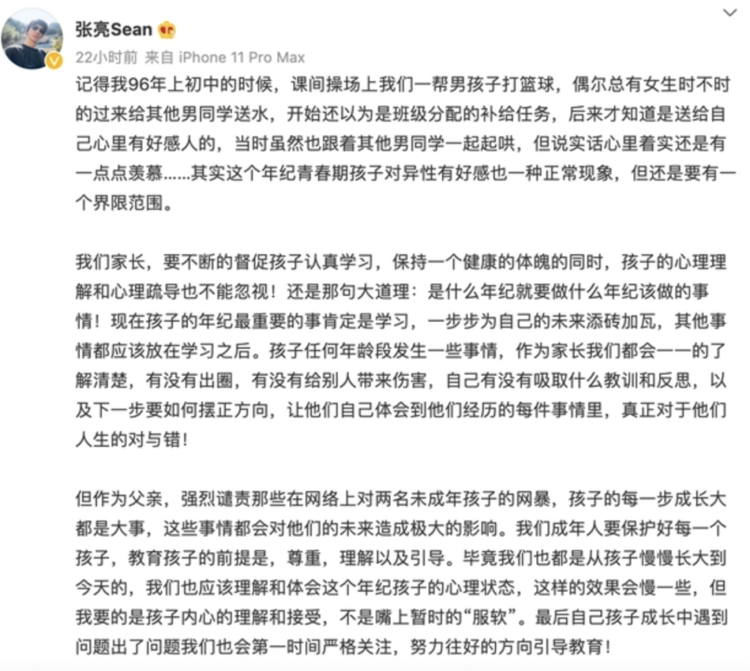 张亮只能出来发长文,呼吁停止对两个孩子的网暴。