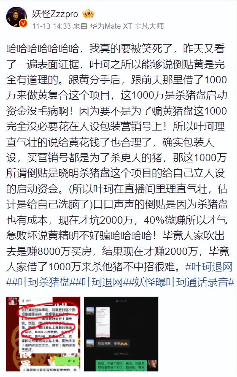 “妖怪”还说是他把叶珂前夫引入战场,从而揭开叶珂的真实面目,叶珂为了平息风波,把黄晓明送她的东西抵给前夫偿还1000万的债务,担心不还钱会被前夫开锤。