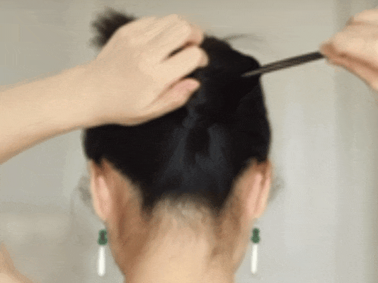 4.簪子压住盘起的那圈头发,从食指指向的位置穿出来。