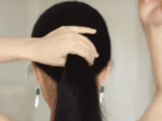 1.先把头发梳顺,左手大拇指朝下捏住头发,固定在脑后。