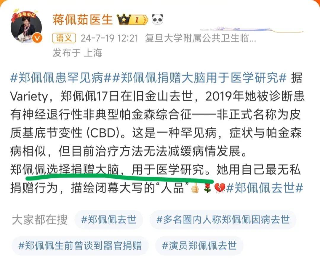 生前早就决定捐赠器官的郑佩佩,死后捐赠出自己患病的大脑,给美国的医疗机构,用于人类未来对于攻克此类脑部罕见部的研究。