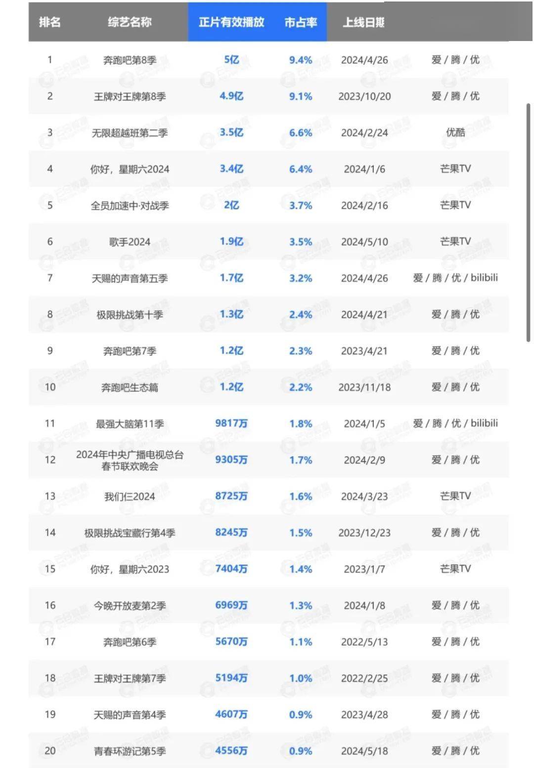 云合数据显示,今年上半年(2024.1.1-2024.6.30)综艺的供给有所回升,共上新126部国产季播综艺(不含衍生、晚会),同比增加7部;综艺大盘的走势整体向好,累计正片有效播放141亿,同比上涨5%。爱芒腾优四大平台综艺正片有效播放在27-41亿之间,其中优酷同比增长77%。