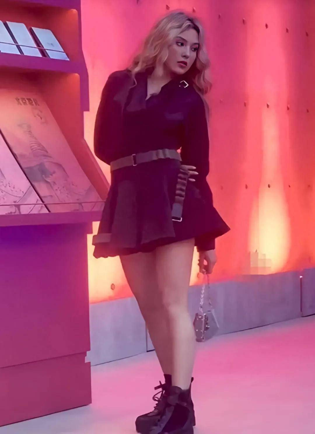 谷爱凌身着黑色上衣与短裙,搭配黑色靴子,简约而不失时尚感。腰间棕色皮带巧妙点缀,勾勒出她曼妙的身姿。金色长发自然垂落,为整体造型增添了几分柔美与灵动。在北京恩礼的粉红色调背景中,谷爱凌的穿搭更显个性与魅力,完美诠释了现代女性的时尚态度。