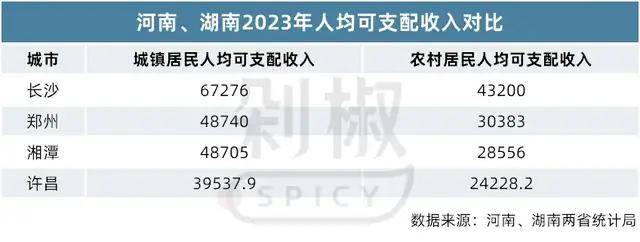 这不得不提到湖南消费市场的活力。以省会城市为例,根据湖南省统计局数据,2023年,长沙市城镇居民人均可支配收入为67276元,农村居民人均可支配收入为43200元。从河南省统计局数据来看,去年河南郑州的城镇居民人均可支配收入为48740元,农村居民人均可支配收入30383元。