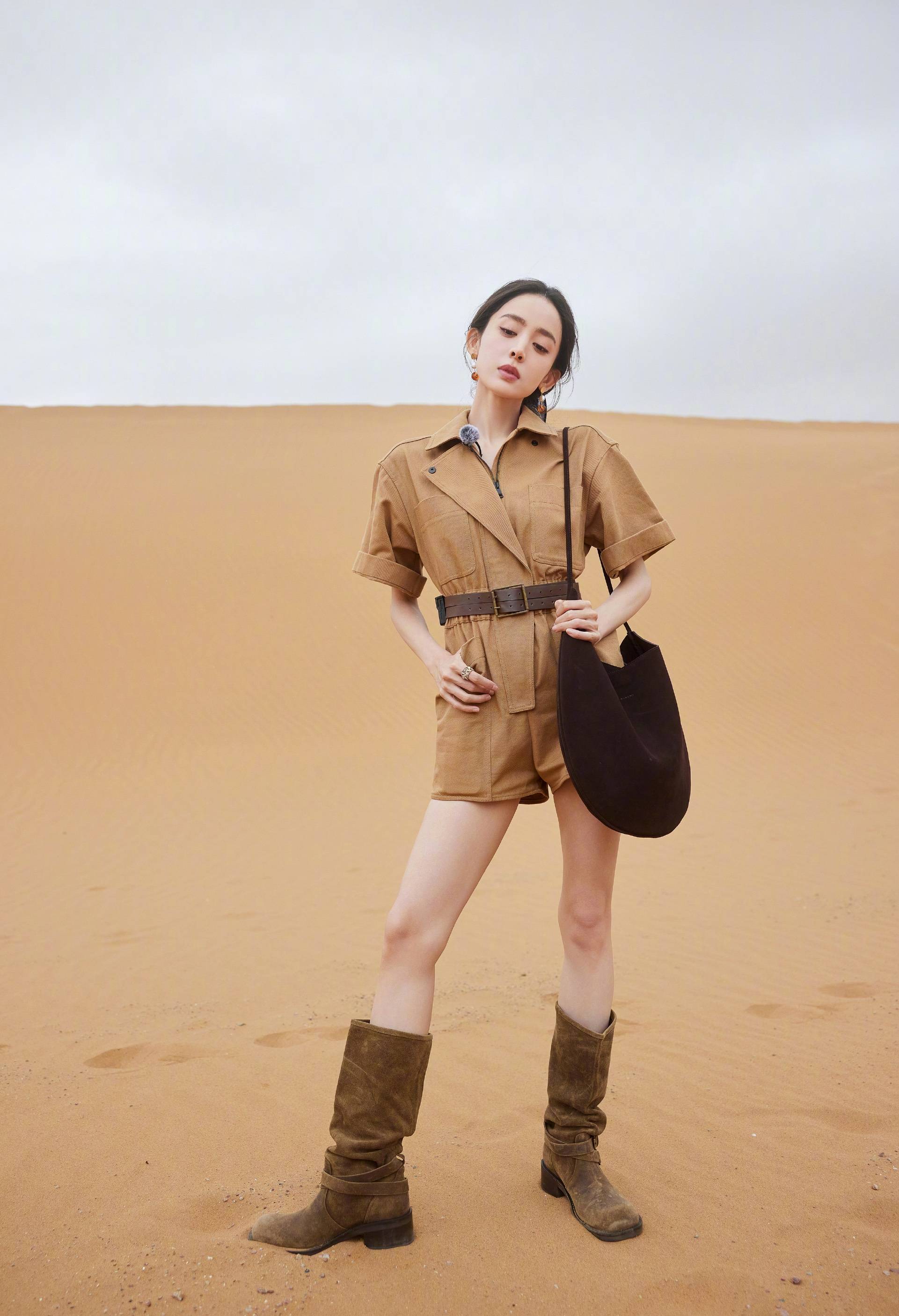 把美拉德带进沙漠,古力娜扎把天地都化为了她的调色盘。干净温柔的大地色连体衣酷飒有型,没有过多的装饰,只以腰带切割视觉,尽显女性干练。站在沙漠中间,脚踩略显厚重的中筒靴,她摆出不羁的pose,散发出遗世独立的野性,颇有些宿命感。待双眼微闭,听得砂砾在周身作响,娜扎表情淡然,仿佛已接受大自然的邀约,共赴一场天荒地老的旅途。