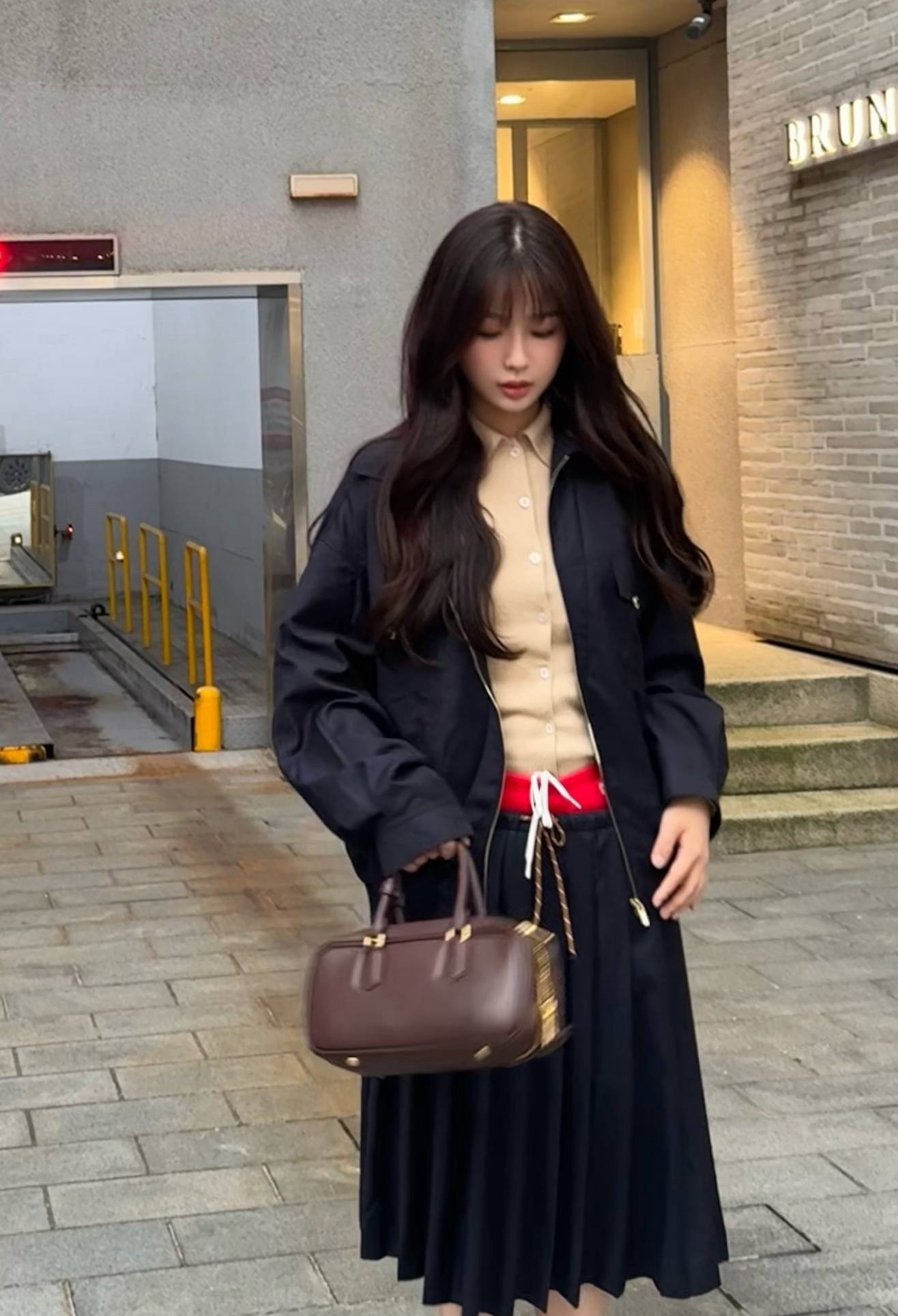 虞书欣一套格雷系造型太有女大即视感。套着挺立的Oversize的深色夹克,本就娇滴滴的虞书欣显得更加小鸟依人。下搭及膝的同色百褶裙,不仅复古优雅,还增添了不少书卷气。腰部一抹亮眼的红,是全身唯一的亮点色,也是她藏不住的个性与追求,打破沉闷的同时,还增添不少邻家妹妹的俏皮。