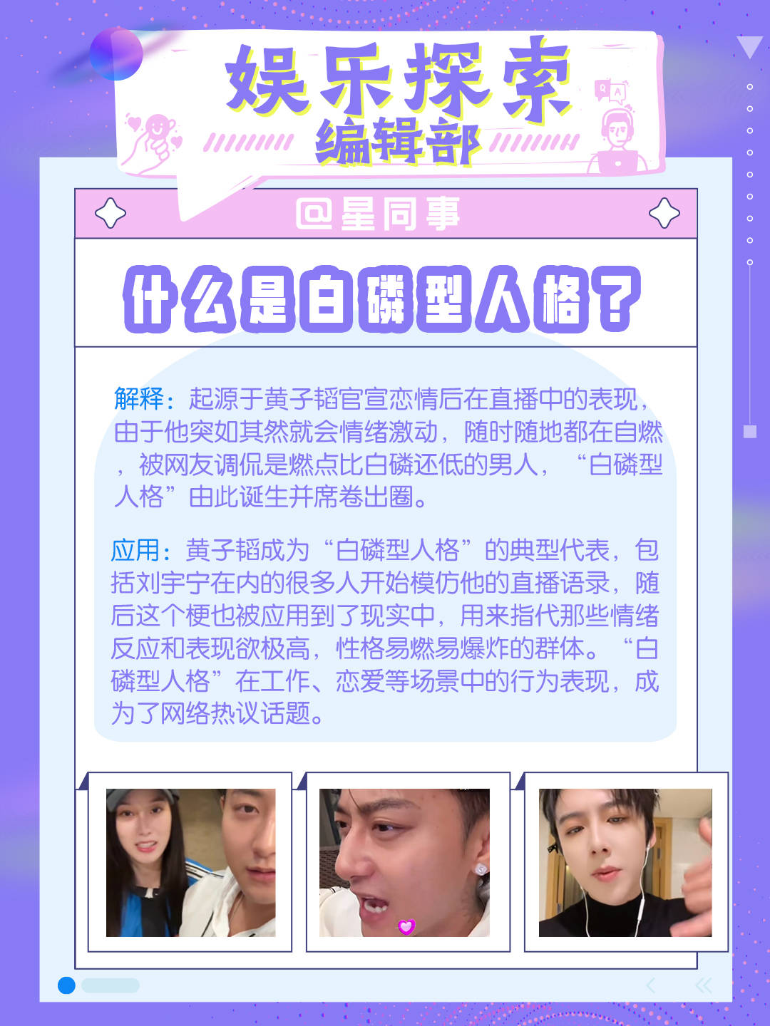 白磷型人格,顾名思义就是指代那些情绪波动强烈,像白磷一样 “易燃易爆炸”的人,而黄子韬则成为了这类人格的典型代表,甚至还有人把黄子韬的燃点分了等级:丢丢燃、中燃、特燃、变态燃。
