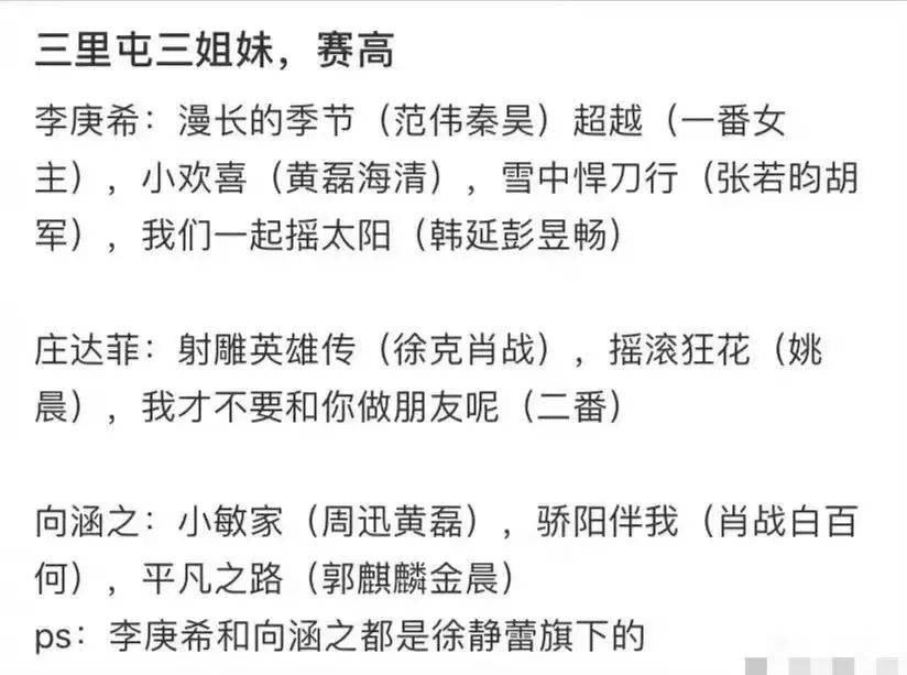 有博主总结“三里屯三姐妹”中,李庚希资源应该是最好的。