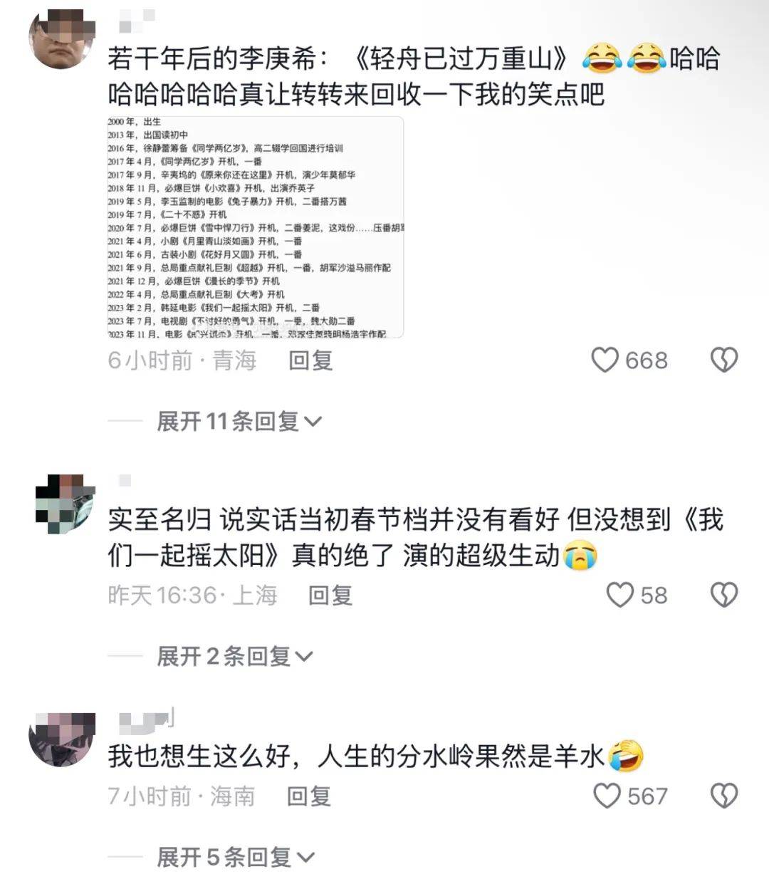 李庚希抖音评论区也涌入了质疑声,同时也有不少观众留言说她在《我们一起摇太阳》里演得好。
