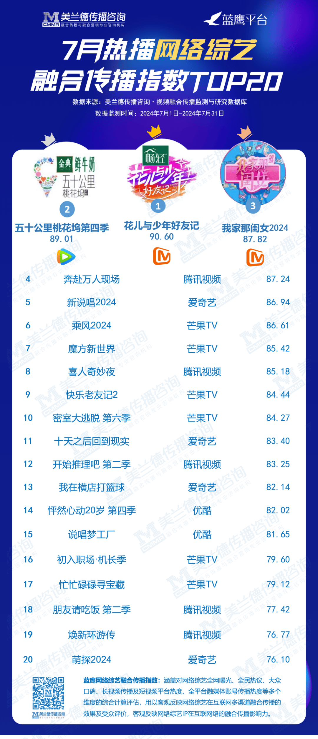 芒果TV《花儿与少年好友记》本月收官,立体勾勒“中国朋友圈”交流面貌,备受赞誉,月网媒关注度、微博视频点击量均位列本月热播网络综艺分维度榜单第一,融合传播指数稳居本月榜单第一;《我家那闺女2024》本月开播,多维展现当代女性生活与职业状态,持续吸引网友追看,融合传播指数位列本月榜单第三;《魔方新世界》热度发酵,月芒果TV视频点击量超10.96亿次,位列本月热播网络综艺分维度榜单第一;《乘风2024》、《快乐老友记》第二季与《密室大逃脱》第六季分别位列本月热播网络综艺榜单第六、第九、第十。