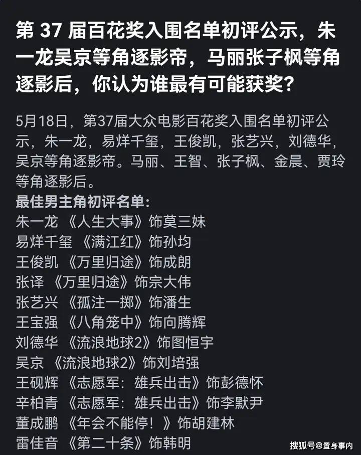 但在片方和出品方复选的时候,就是不报这些演员的名字,而是强行跳过主扛票房的一番男主角去提名男二号,然后造成了如今尴尬的入围名单。