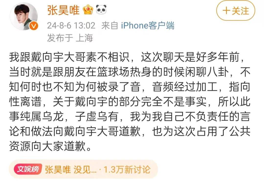 接着,张昊唯发文回应,表示他不认识戴向宇,这次聊天是多年前,他和朋友在篮球场热身的时候闲聊,录音是经过加工的,戴向宇的那部分完全是子虚乌有,他向戴向宇道歉,也抱歉占用了公共资源。