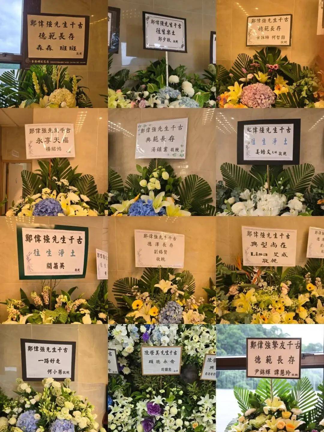 当天的灵堂布置的虽然很简洁,但是却不失礼于人,大堂中放着逝者郑伟强的遗照,周围则是被亲友的花篮包围成花海,当中包括苗侨伟夫妇的花篮、郑则仕夫妇的花篮、周润发夫妇的花篮,而刘德华、汤镇业、郑少秋等艺人也是纷纷用个人的名义为郑伟强送上花篮。