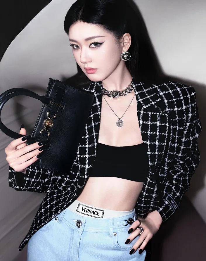 当时赵露思穿着粉色格子套装,和范思哲总监Donatella·Versace的这张合影也蛮出圈的,合照中透露着一种“张牙舞爪又上不了台面”的俗气,实在太不协调了。