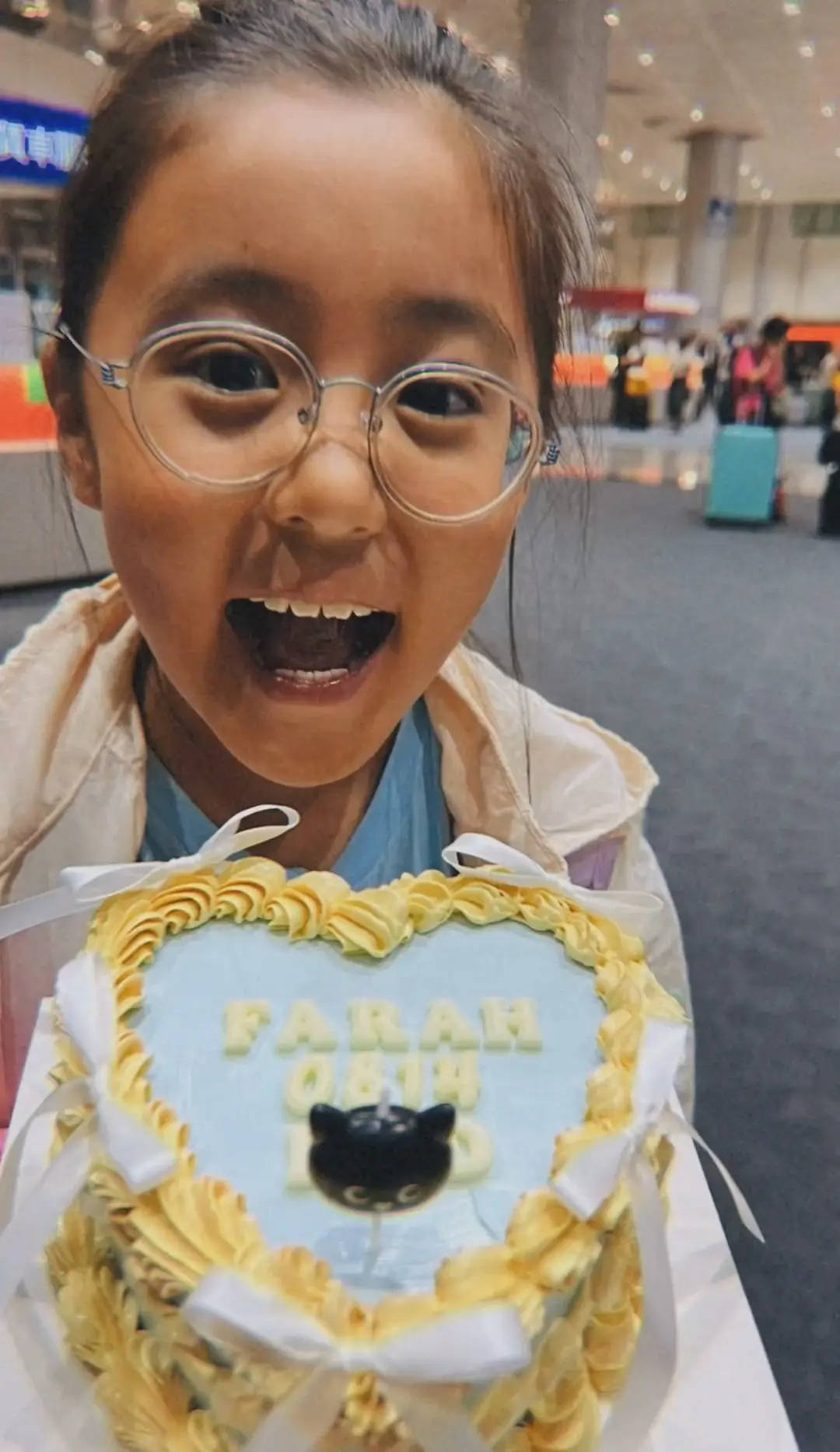 咘咘捧着生日蛋糕,开心大笑。