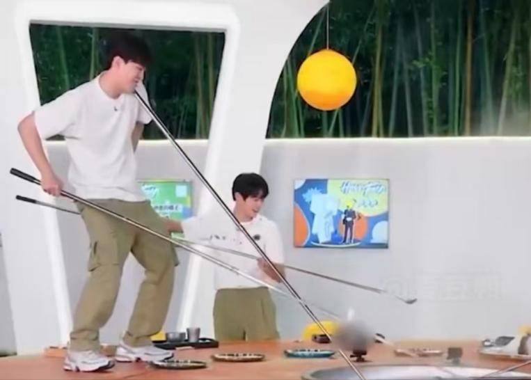 除此以外,在另一个节目中,当嘉宾被节目组要求用超长餐具吃火锅时,其他人都很注意形象,站在地上在锅里捞,而范丞丞竟然直接站在了“桌子”上,把旁边的李诞都整无语了。
