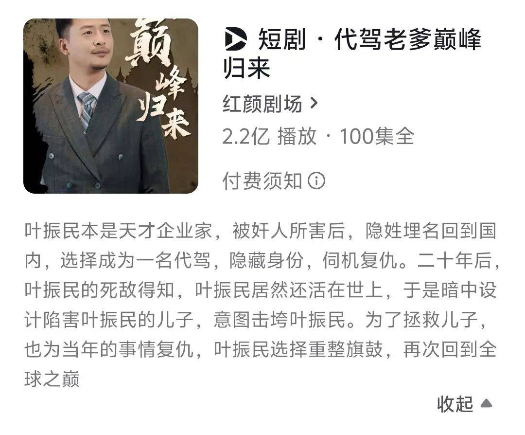 目前代表作有《代驾老爹巅峰归来》《犬父虎子》《老炮儿之上阵父子兵》等,从剧名上就可见,男频和女频的“经典分流”,在中老年短剧上也得以保留。