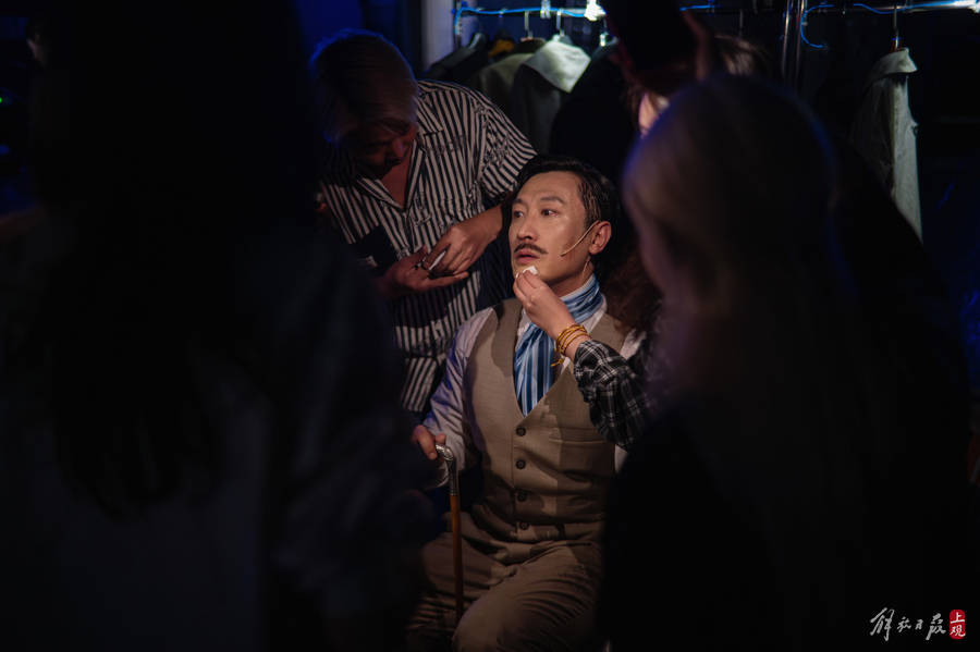 演出过程里造型师为演员们抢妆。这是一部一幕戏作品,场景固定,叙事的推进依靠人物造型的转变来实现。