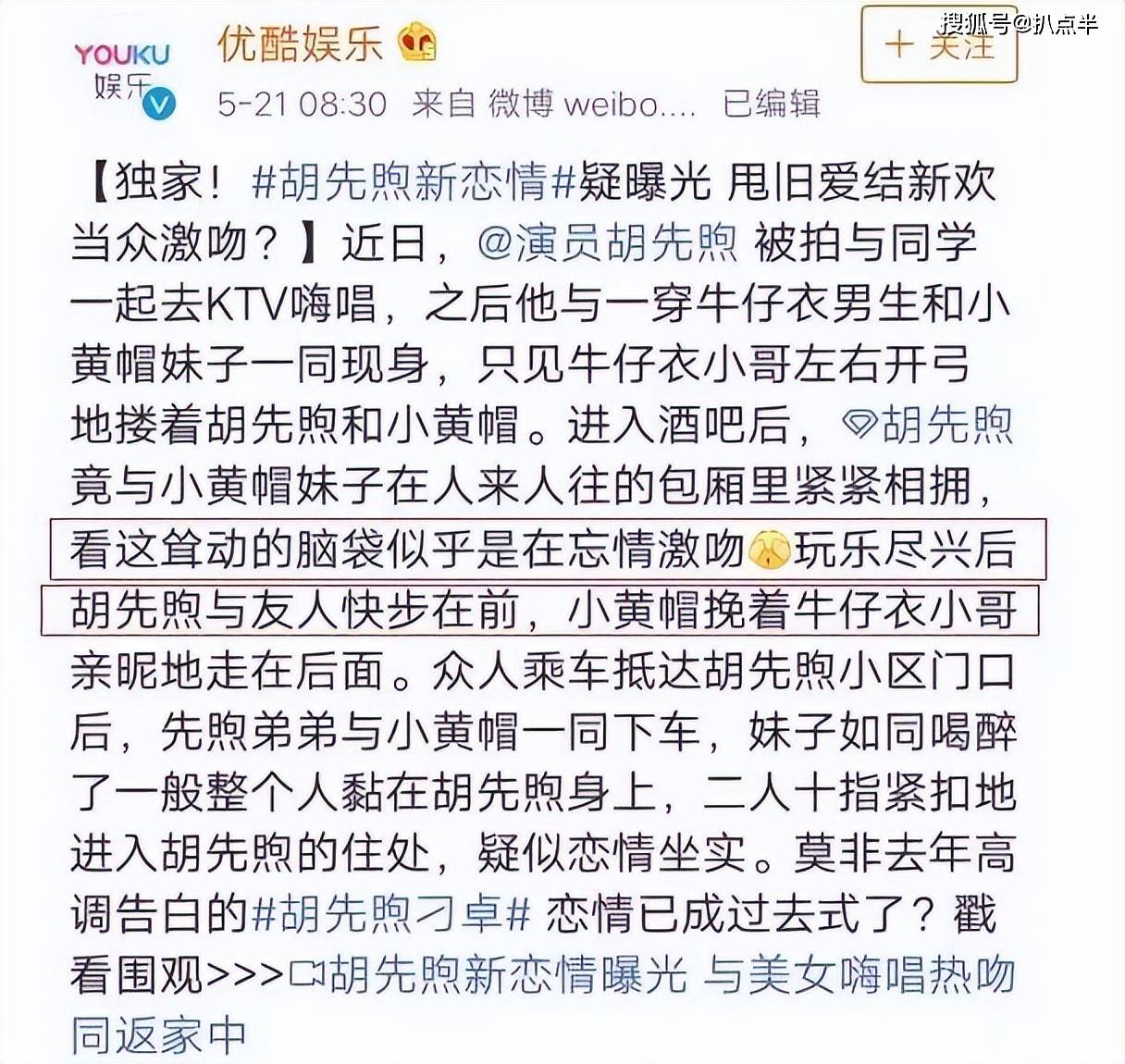 而次日,胡先煦便被拍到与好友在KTV唱歌,还与同行的一个陌生女孩当街拥吻,再曝恋情。