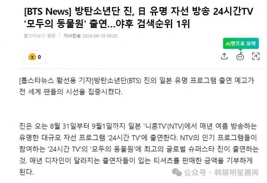 8月19日,有韩国媒体报道,韩国知名男星,防弹少年团BTS成员金硕珍Jin,出现在日本著名的24 小时慈善广播《大家的动物园》(志村动物园),在日本最大的门户网站上登上搜索排名第一,引起了世界各地粉丝的关注。
