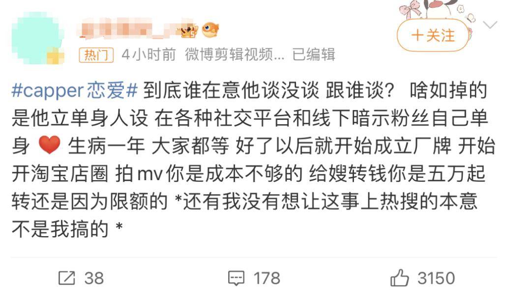 接着,便是今天的热搜,因为“单身的人设”,让Capper没能和其他Rapper一样,在恋情曝光时让大家集体祝福,反而引发了一些争议。