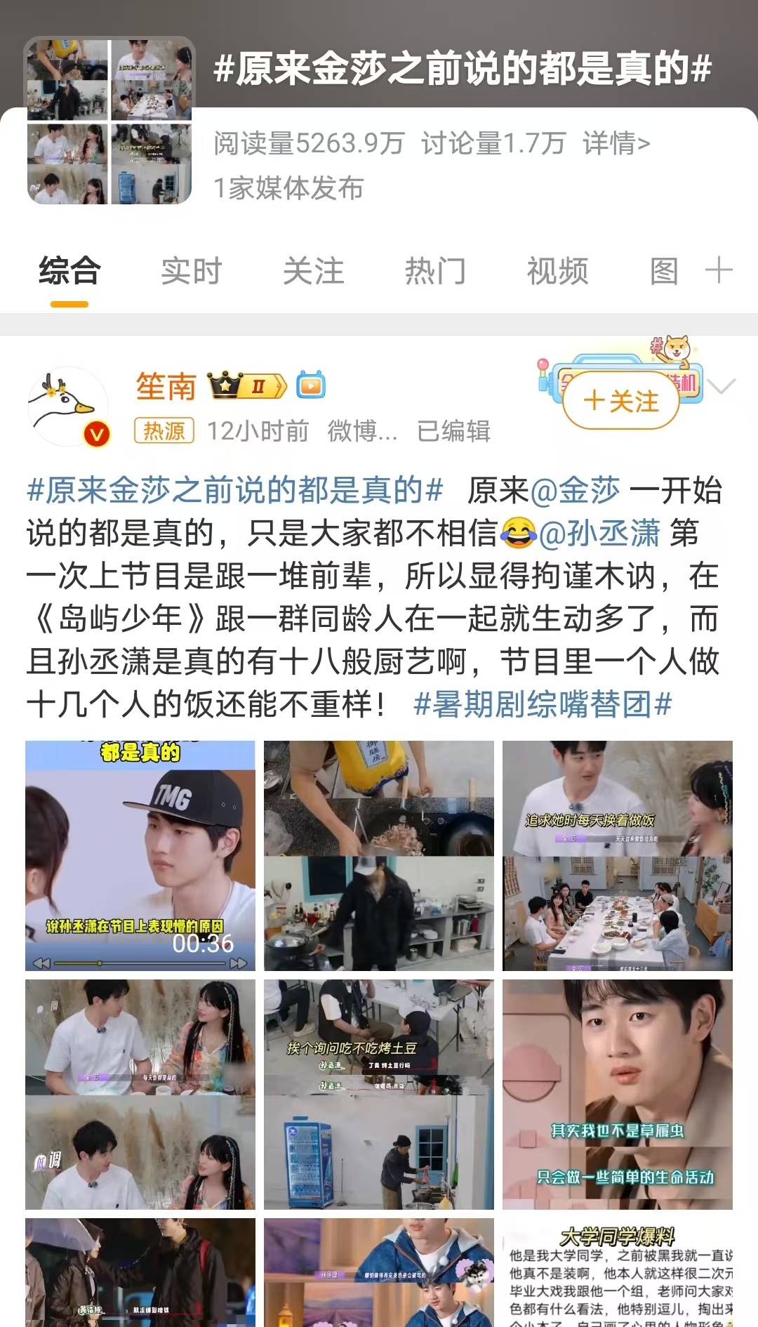 8月24日,随着《岛屿少年》的播出,孙丞潇的名字突然冲上热搜。在节目中,他与同龄人相处融洽,活泼生动的表现与之前在公众面前木讷的形象形成鲜明对比。金莎曾解释过,孙丞潇在之前的节目中表现紧张是因为刚毕业,面对诸多资深前辈而感到压力。然而,在《岛屿少年》中,他显然更加自在,展现出了自己真实、多才多艺的一面。
