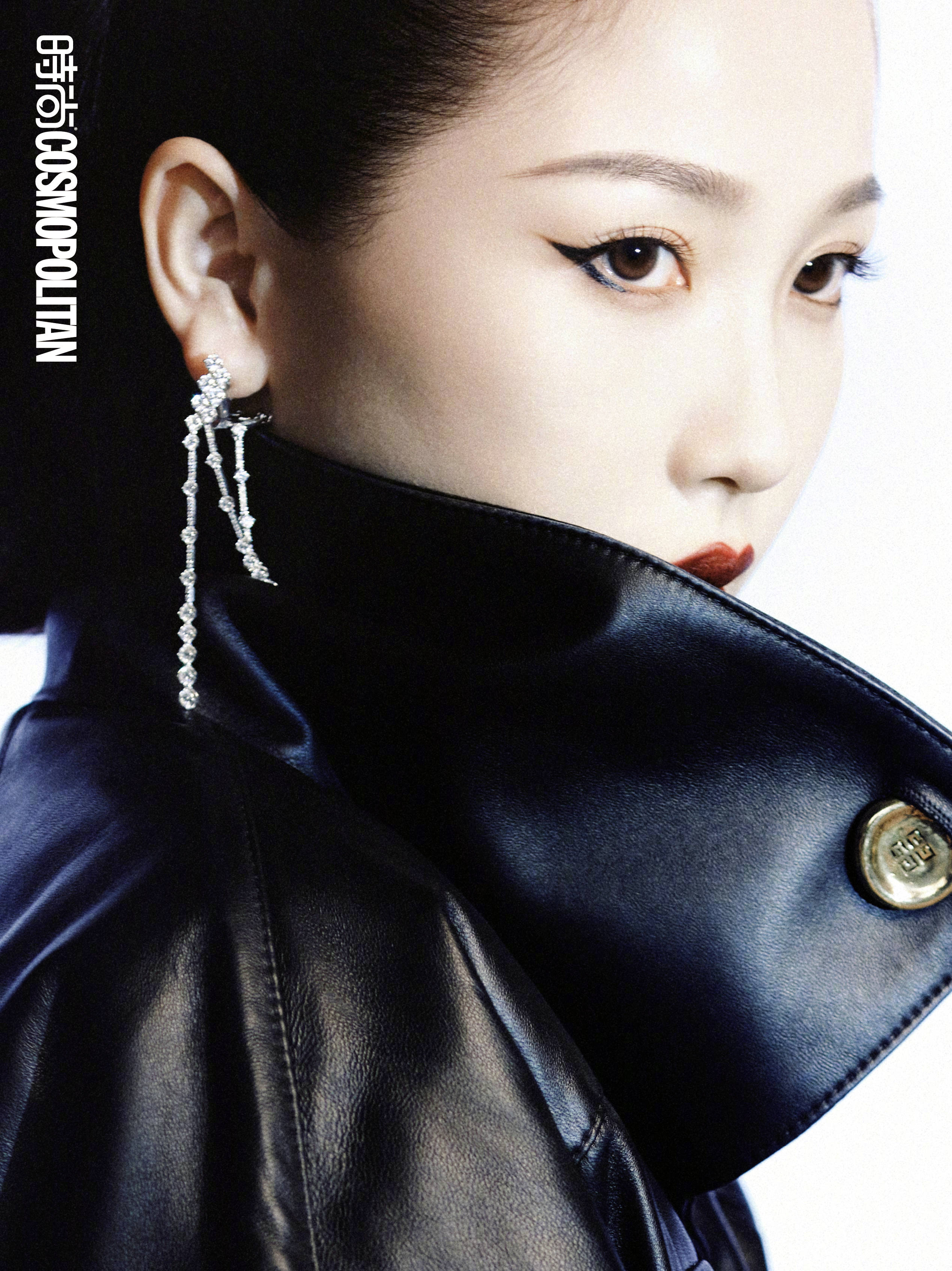 虞书欣穿皮衣,搭配黑色眼线,看起来气场十足。