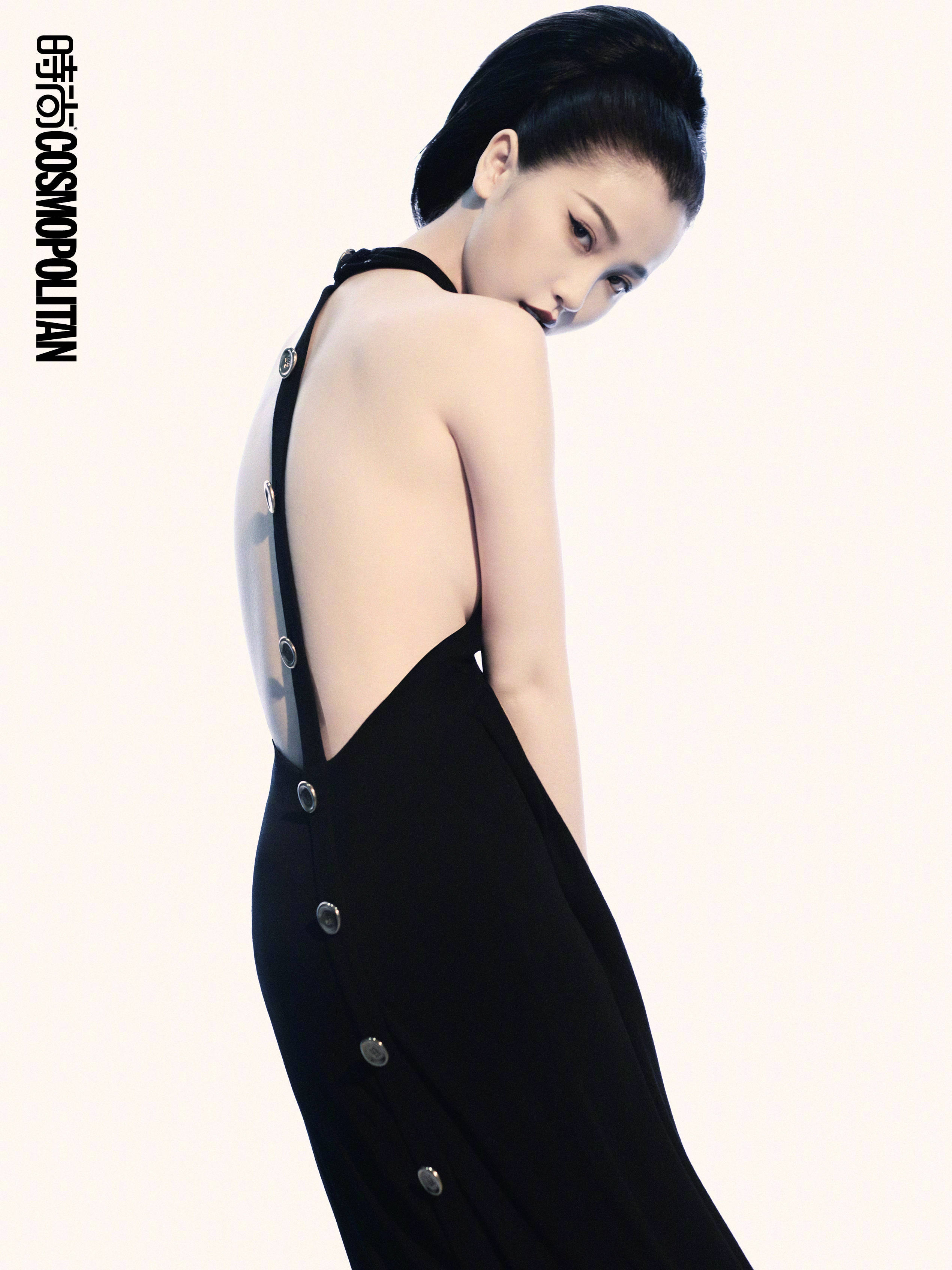 虞书欣扎高马尾,穿黑色露背裙秀美背,眼神撩人。