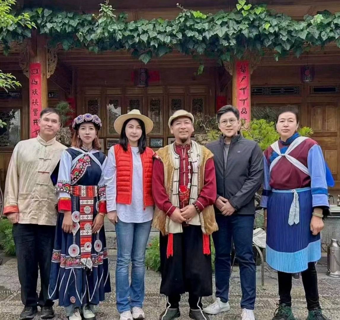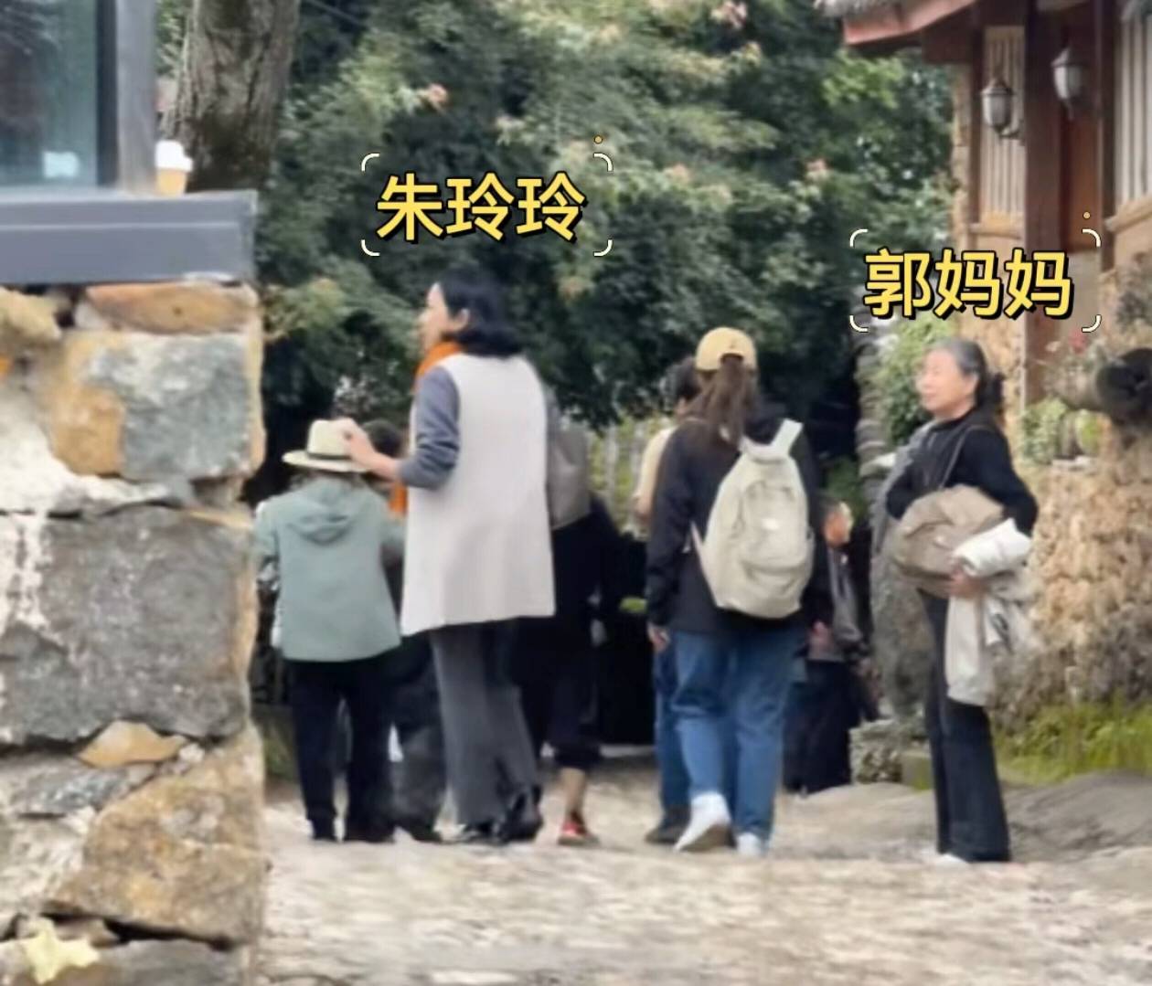 不久前,郭晶晶一家在酒店附近的花园里看玉龙雪山也被拍到,当时就有网友猜测穿黑色背心的是婆婆朱玲玲。